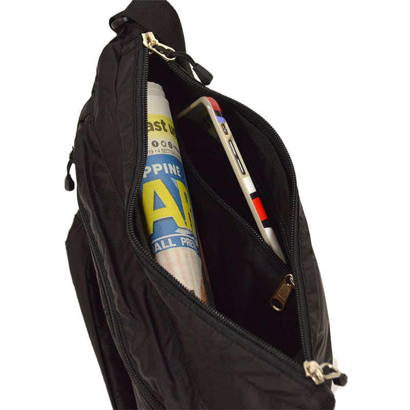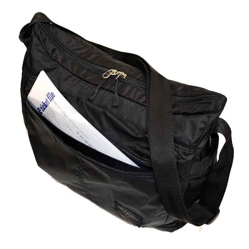 Eチケット収納ポケットが、出し入れのしやすいところに付いています。ソフトで軽く、丈夫なナイロン生地を使用しています。 表生地には撥水、撥油機能に優れたテフロン加工を施しています。B5サイズが入る大きさです。左側にはファスナー付拡張ポケット、右側には拡張できるメッシュポケットが付いています。